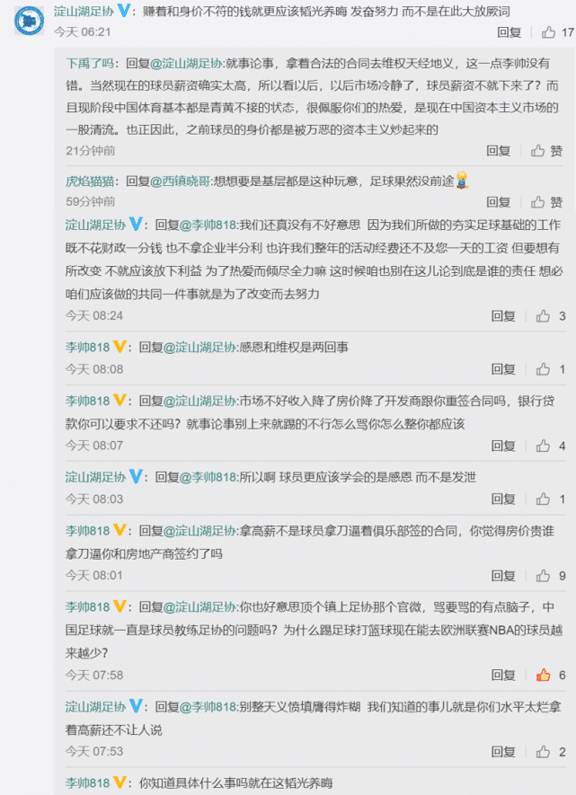 然而,根据国内媒体的消息称,某北方俱乐部对球员重新签约并不尊重,强硬要求球员签约,不同意签约的都被赶回家。所以,前广州恒大门将,现上海申花门将李帅在社交账号上为球员发声,认为球员赚不到属于自己身价的钱并不是球员的错,球员拿着合同去讨薪不是恬不知耻。万万没想到的就是,李帅的发言遭到地方足协的回怼,认为他大放厥词。来自昆山市淀山湖镇足球协会的官方账号上对李帅进行回复:“赚着和身价不符的钱就更应该韬光养晦 ,发奋努力而不是在此大放厥词”。