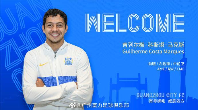 经我俱乐部与葡萄牙阿尔瓦伦加足球俱乐部友好协商,就巴西籍球员吉列尔梅·科斯塔·马克斯(Guilherme Costa Marques)加盟事宜双方达成一致,从即日起,吉列尔梅(粤语译名:古希美)正式加盟广州城足球俱乐部,双方签订了一份为期3年的工作合同。