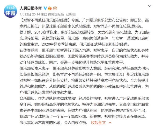 “临危受命”和“回归初心”,很可能是郑智这一次从总经理岗位“上课和下课”的关键剧情。恒大从亚冠小组赛耻辱性出局,再加上中超丢冠,“四大皆空”的影响深远,所以营造出“卡纳瓦罗需要负责”的气氛。然而,“人民日报体育”透露郑智当初当选总经理,是俱乐部与其为谋划开启新的职业生涯所决定的。而郑智的“下课”反而是他个人意愿,想继续踢球而选择下课的。