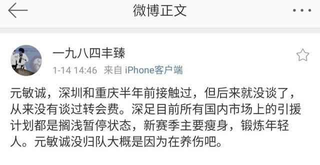 丰臻微博写道:“元敏诚,深圳和重庆半年前接触过,但后来就没谈了,从来没有谈过转会费。深足目前所有国内市场上的引援计划都是搁浅暂停状态,新赛季主要瘦身,锻炼年轻人。元敏诚没归队大概是因为在养伤吧。”