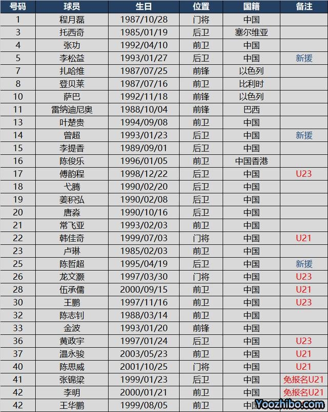 本次富力一线队名单中有8名U23球员,包括黄政宇、韩佳奇、王鹏等有中超经验的球员。除此之外富力还有3名免报名的U21球员,分别是后卫张锦梁,前卫李明和王华鹏。