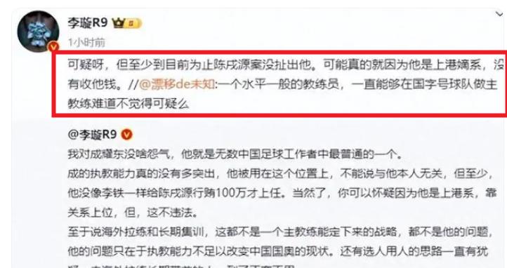 名记“卖萌谁在行”曝出成耀东是陈码头选的,而足球报的李璇说的更是直接,李璇在社交媒体上表示:成耀东是上港系的,能够拿到国字号球队的资源完全是因为他靠关系上位,和陈码头混的原因。