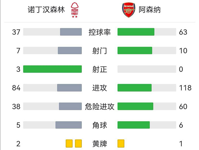 全场比赛结束,阿森纳0-1诺丁汉森林。