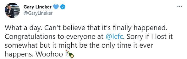 360直播吧讯 北京时间5月16日,足总杯决赛,莱斯特城1-0小胜切尔西,夺得队史第一座足总杯冠军。赛后,莱斯特城名宿莱因克尔更新推特。