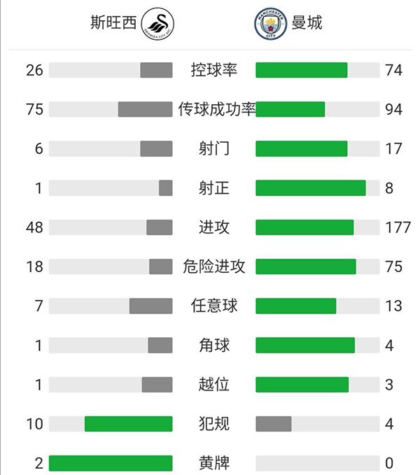 曼城3-1斯旺西 斯特林单刀破门热苏斯建功