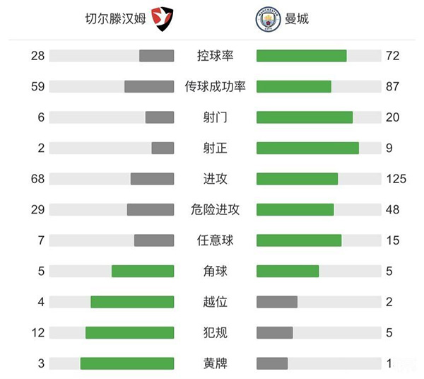 全场比赛结束,切尔滕纳姆1-3曼城。