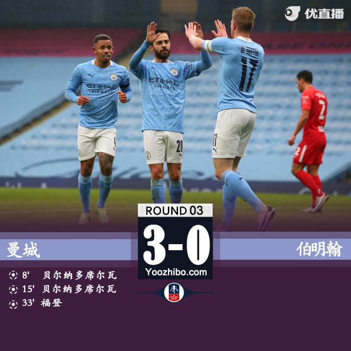 来源:360直播吧01-11 00:58 360直播吧讯:北京时间1月10日21:30,足总杯第三轮比赛,曼城对阵伯明翰。上半场,B席开场不久就凌空抽射破门,随后接德布劳内助攻再下一城,热苏斯造险,福登贴地斩建功;下半场,热苏斯禁区内倒地但裁判没有表示,马赫雷斯破门但越位无效,曼城3-0伯明翰晋级足总杯第四轮。