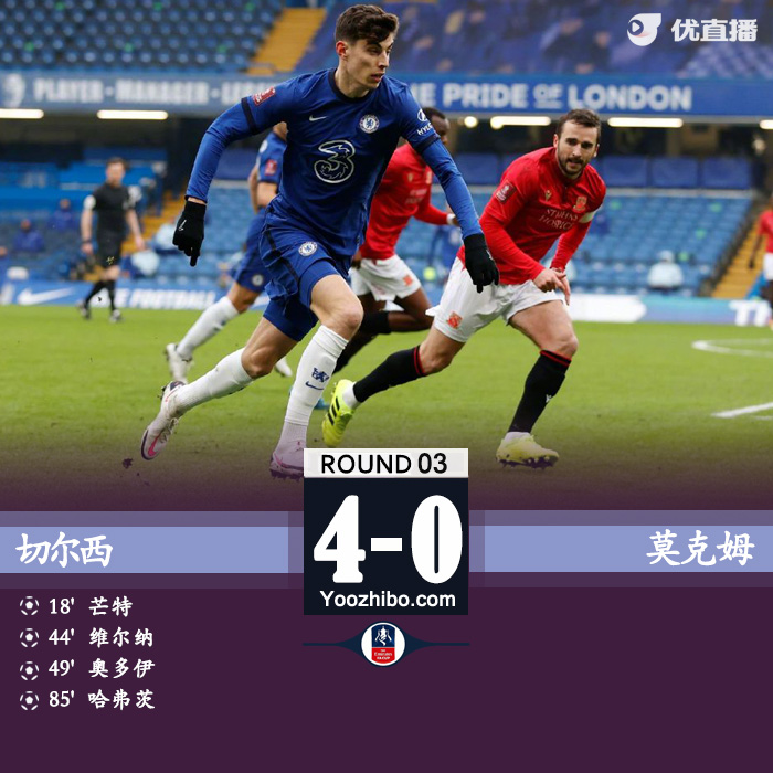 第85分钟蓝军再次破门,阿兹皮利奎塔右路传中,哈弗茨中路前插力压防守头球破门,4-0,切尔西领先!