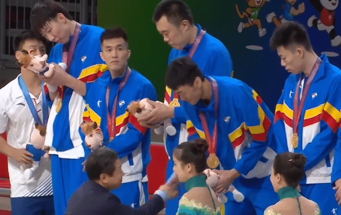 辽宁队这边全员则是微笑挂在脸上,尤其是张镇麟,这是小伙子拿到的第一块金牌,拿着端详了很久,而到教练员这边,杨鸣让刘玉栋给蒋兴权戴上,蒋老推辞了好久最后戴上了,辽篮这批小伙子都是在他的注视下长大的,80多岁了仍在跟着球队征战,值得我们点赞,祝福辽宁队!