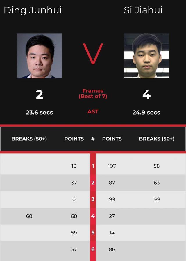 第四局斯佳辉得到27分中断进攻,丁俊晖打出单杆68分挽回一个赛点,第五局丁俊晖赢得缠斗59-14再追一局,第六局双方上演失误大战,斯佳辉抓住机会多次上手锁定比赛的胜利。