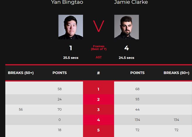第五局颜丙涛只得到18分,克拉克一杆72分锁定胜局,颜丙涛总比分1-4惨遭一轮游。