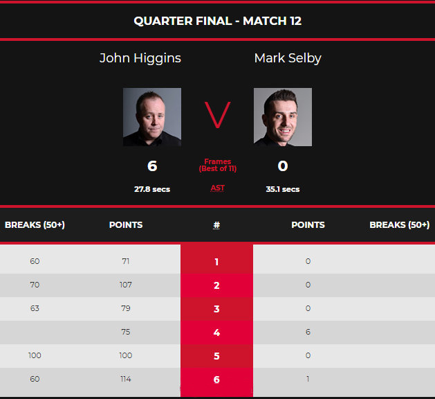 第五局,希金斯再次争夺火热进攻手感,他轰出单杆100分,100-0第四次零封塞尔比,这样的比分让塞尔比极为难堪,希金斯也极为轻松地赢得了赛点。