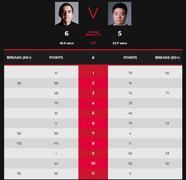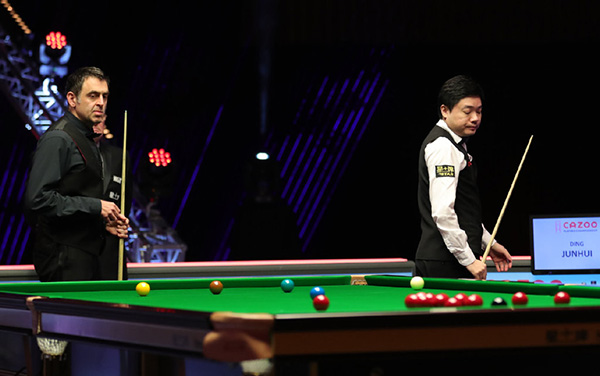第9局比赛中,丁俊晖压力下打进一杆超远台进攻,围球连得53分后转入防守,奥沙利文拼进红球后贴咖啡球做斯诺克,丁俊晖成功解球后建立优势,随后再度上手超分胜出这局,挽救一个赛点4-5落后。第10局,奥沙利文本有机会一杆清台结束比赛,但在处理黄球时出现走位失误,导致打丢了有难度的绿球,这次失误让他气急败坏地将架杆狠狠扔在地上。丁俊晖笑纳大礼,两人战成5平。决胜局,丁俊晖尝试长台进攻未果,奥沙利文抓住机会打出单杆95分,赢下比赛。