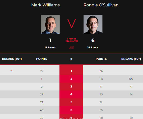 第六局,威廉姆斯进攻还是没有起色,在胶着的比赛中,奥沙利文从通过几次上手,65-40再胜一局,比分优势进一步扩大到5-1,并赢得本场比赛的赛点。