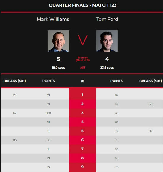 第八局,福德又以65-19挽救第二个赛点,比分追成4-4。第九局,威廉姆斯再也没有的给对手机会,72-35锁定胜局,总比分5-4携手奥沙利文等晋级。