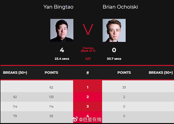 第三局,颜丙涛找到进攻手感,打出单杆114分再下一局,大比分3-0领先奥乔斯基,拿到赛点。第四局,颜丙涛再接再厉,单杆79分取得胜利,大比分4-0战胜奥乔斯基,顺利晋级威尔士公开赛第三轮。颜丙涛下一轮的对手将是另一位中国球员肖国栋。
