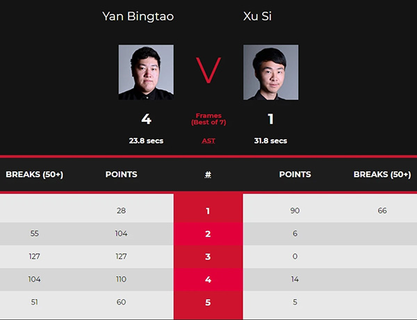 第一局,颜丙涛单杆28分防守,防守比拼,徐思精彩的中袋上手,单杆66分,徐思大角度红球没有薄进;颜丙涛摔袋,徐思单杆20分拿下第一局。第二局,徐思单杆4分,推底袋红球不进;防守比拼,颜丙涛中袋上手,单杆22分,黑球失误;徐思两次打进红球,都没有校到黑球;颜丙涛长台上手,单杆22分,防守;徐思防守留下机会,颜丙涛单杆55分清台拿下第二局。双方1-1。