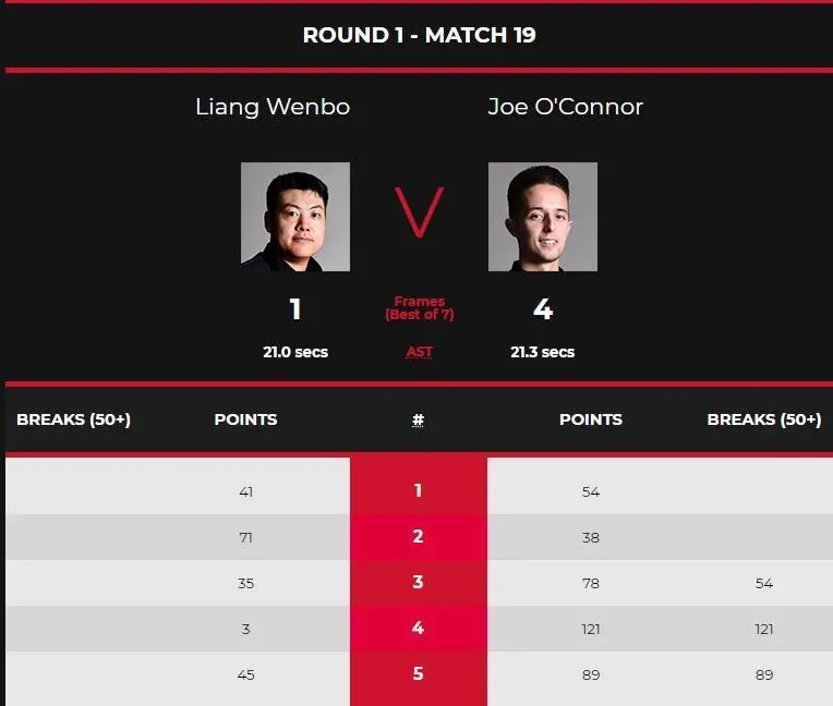 第一局,奥康纳开球留下机会,梁文博单杆10分失误;奥康纳单杆12分,拼顶袋红球不进;梁文博1分失误;奥康纳1分失误;梁文博单杆30分,蓝球不进;奥康纳单杆41分以54-41拿下第一局。第二局,梁文博单杆26分,以53-11领先;梁文博防守留下机会,奥康纳薄中袋上手,单杆7分;梁文博没有打到红球犯规留下机会,奥康纳单杆22分绿球失误;梁文博单杆18分以71-38有惊无险拿下第二局。双方1-1。