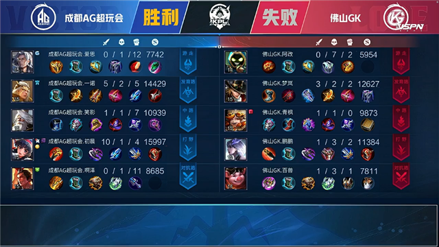 双方和平开局,2分30秒成都AG拿下第一条暴君,3分24秒成都AG上官婉儿越塔单杀姜子牙拿下一血。4分06秒成都AG上官婉儿击杀廉颇,5分16秒成都AG拆掉佛山GK上路一塔。5分42秒佛山GK拆掉成都AG上路一塔,6分钟中路团成都AG打出0换2。6分42秒成都AG拆掉佛山GK中路一塔,佛山GK击杀上官婉儿。7分36秒佛山GK拆掉成都AG下路一塔,8分钟中路团战成都AG打出0换2。10分41秒成都AG拆掉佛山GK中下路二塔,11分20秒成都AG拿下暗影主宰。11分50秒佛山GK上路二塔被破,成都AG击杀曜。12分13秒团战成都AG打出0换5团灭佛山GK,一波拆掉水晶拿下胜利。