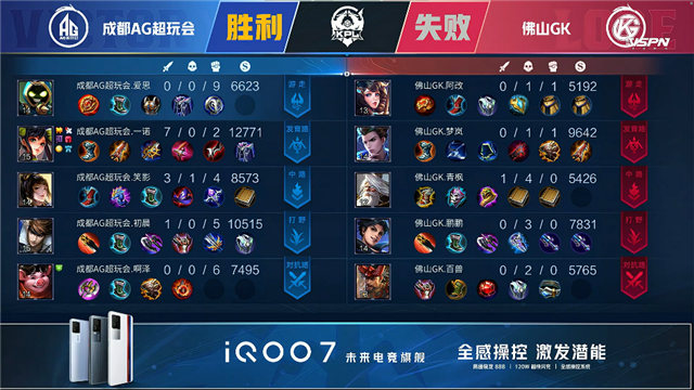 双方和平开局,2分40秒佛山GK反蓝,成都AG娜可露露击杀沈梦溪拿下一血。3分28秒佛山GK拿下先知主宰,4分35秒佛山GK拆掉成都AG下路一塔。5分30秒野区团佛山GK击杀吕布,6分36秒团战成都AG击杀太乙真人。8分12秒下路团战,佛山GK打出0换2,8分40秒佛山GK拆掉成都AG下路二塔,8分50秒成都AG娜可露露双杀。10分35秒成都AG击杀暗影暴君,11分35秒成都AG拆掉佛山GK中上路二塔,团战打出1换4。12分14秒成都AG拆掉佛山GK中路高地,14分31秒成都AG后羿击杀太乙真人。16分10秒成都AG拿下暗影暴君,16分54秒下路团成都AG打出0换3,拆掉佛山GK下路高地一波摧毁其水晶。