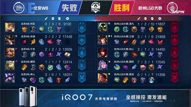 1分45秒,北京WB下路越塔打出0换2,马超拿下双杀。2分45秒,杭州LGD拿下暴君。2分57秒,杭州LGD下路击杀马超。3分16秒,北京WB沈梦溪击杀太乙真人。4分29秒,中路团,杭州LGD打出0换2。5分钟,杭州LGD拿下主宰。5分21秒,北京WB破掉杭州LGD下一塔。6分50秒,杭州LGD露娜击杀孙膑。8分33秒,北京WB中路打出0换2。8分53秒,北京WB破掉杭州LGD中一塔。9分20秒,北京WB破掉杭州LGD上二塔,随后马可波罗1v2拿下双杀。11分13秒,北京WB拿下黑暗暴君。12分20秒,北京WB打退杭州LGD后破掉其下二塔。13分15秒,野区团,杭州LGD打出0换4,孙尚香与露娜拿下双杀。13分50秒,杭州LGD陆续破掉北京WB上、中二塔,随后控下主宰。16分22秒,双方团战1换1。17分53秒,杭州LGD拿下黑暗暴君。20分57秒,双方团,杭州LGD打出0换2并控下风暴龙王。22分36秒,杭州LGD破掉北京WB中高地。23分钟,杭州LGD破掉北京WB下高地。24分30秒,中路团,杭州LGD打出0换3。24分53秒,杭州LGD破掉北京WB水晶2:0拿下比赛。