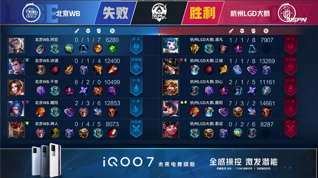 双方和平开局。2分30秒,杭州LGD拿下暴君。3分18秒,中路团,廉颇反手大到5人击飞3人,北京WB打出1换3,不知火舞拿下双杀。5分12秒,北京WB橘右京单杀娜可露露。5分30秒,北京WB破掉杭州LGD上一塔。6分35秒,杭州LGD击杀廉颇。12分17秒,杭州LGD拿下黑暗暴君,随后团战双方1换1。13分55秒,杭州LGD四人集火击杀橘右京,随后控下主宰。14分18秒,杭州LGD破掉敌方中一塔。14分56秒,杭州LGD不知火舞反打拿下双杀。15分23秒,杭州LGD娜可露露单杀橘右京,但随后被不知火舞击杀。16分11秒,杭州LGD马可波罗极限击杀不知火舞。16分43秒,杭州LGD拿下黑暗暴君。17分11秒,野区团,杭州LGD打出0换5。17分30秒,杭州LGD一波摧毁北京WB水晶先下一城。